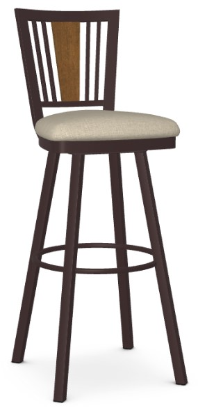 Upholstered seat and metal backrest with wood veneer accent.