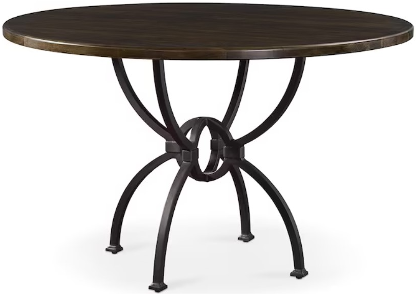 Rising from a forged metal base with dramatic curves, its antiqued bronze finish makes quite a statement. Maple top is available in finishes ranging from greys and whites to deep browns in store, all lightly distressed.