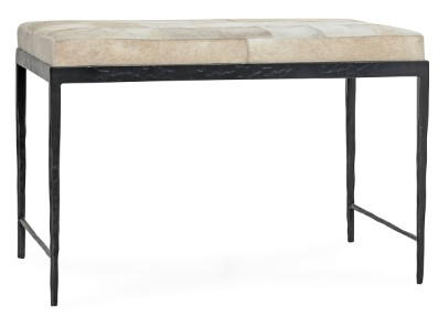 Achen Collection 28" Bench; Hair on Hide, Embossed Hammered Iron; Upholstered genuine hair-on-hide patchwork seat with a foam cushion. Benches come to the rescue as space-efficient alternatives to traditional seating options. Their compact size makes them easy to move around and tuck away when not in usRead More