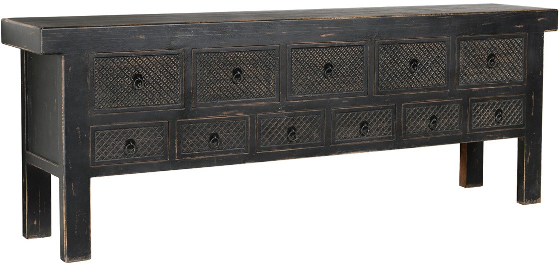 Lahey is made with reclaimed pine wood that has been hand distressed to enhance the beauty of the wood’s natural variations. The sideboard’s black finish is broken up by 11 drawers, each with a hand carved pattern. The piece’s generous proportions and ample storage make it both a statement piece and practical addition to any space.