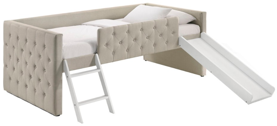 The Intercon Addyson Fog Twin Upholstered Youth Bed features a soft, fog-colored fabric upholstery with a cushioned headboard for added comfort. This twin-sized bed offers a sturdy frame, perfect for a child's room. Its neutral, versatile design easily complements various decor styles, making it both a stylish and practical choice.Read More