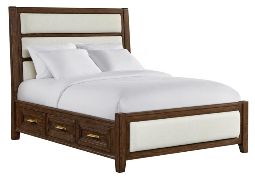Uniquely upholstered headboard and footboard on the beds are offered in King and Queen sizes and come in standard or storage side rail options. The unique hardware used throughout this collection comes in a rich brushed gold finish which perfectly magnifies the warm tones seen throughout the sable brown finish.