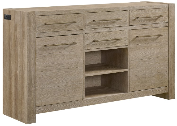 This sturdy dining group features clean, modern design elements blended with the casual nature of lightly wire brushed pine solids and veneer. Shown in a beautiful Weathered Sand finish. The cast bar pull hardware on the Sideboard has an antique pewter finish.Read More