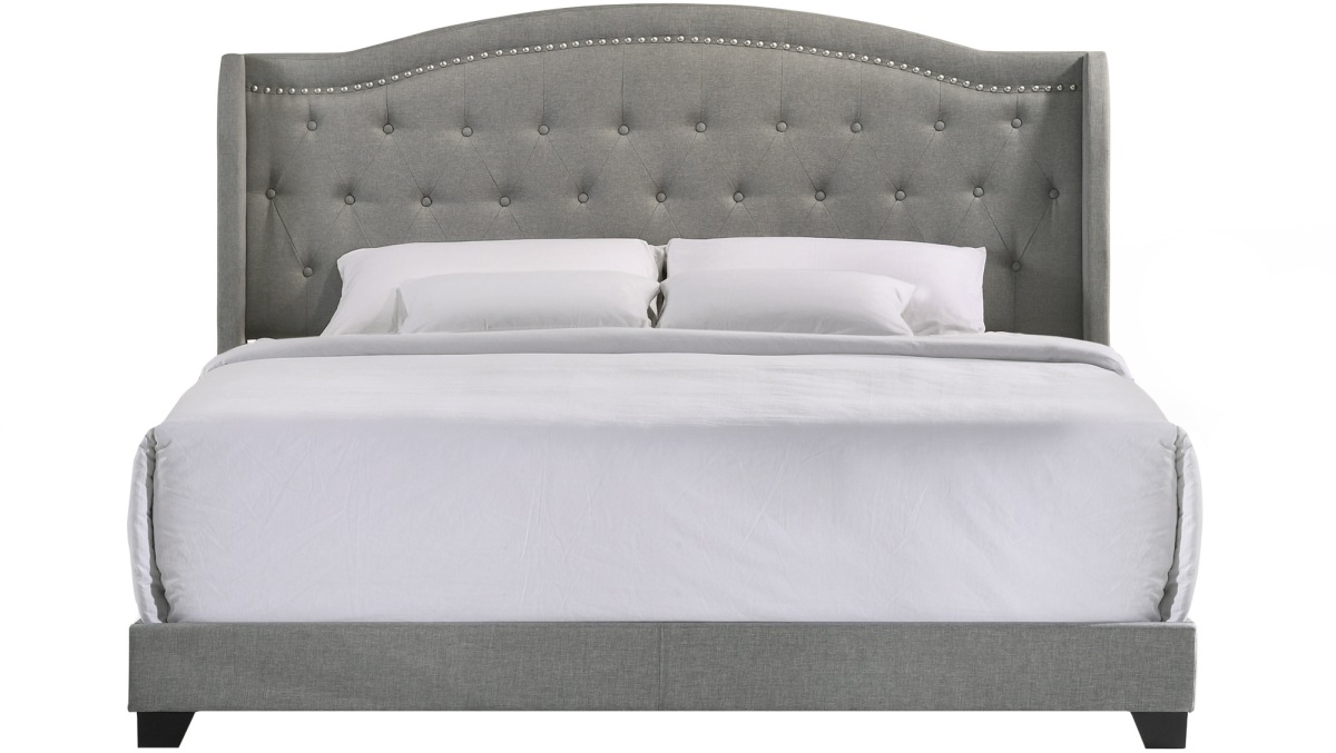 The Rhyan Upholstered Bed Collection features a Smoke Fabric covering an Tufted Cushion, Arched Headboard with eye-catching Matte Chrome Nail Head Accents. The Poplar and Rubberwood Construction rounds out this collection, making it not only stylish but durable as well.Read More