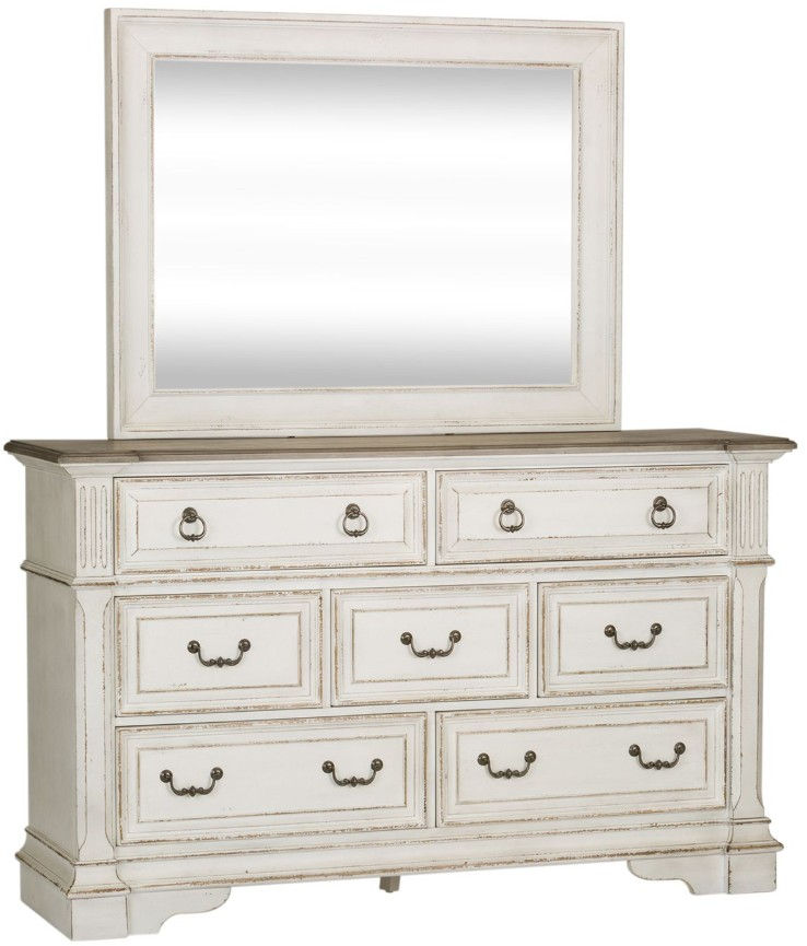 Design possibilities are endless with the Abbey Park dresser and mirror. Crafted of poplar solids and cathedral white oak veneers, this kit features an antique white finish with heavy chipping and a weathered brown whitewash top, full extension drawers, premium felt lined top drawers and cedar lined bottom drawers.Read More