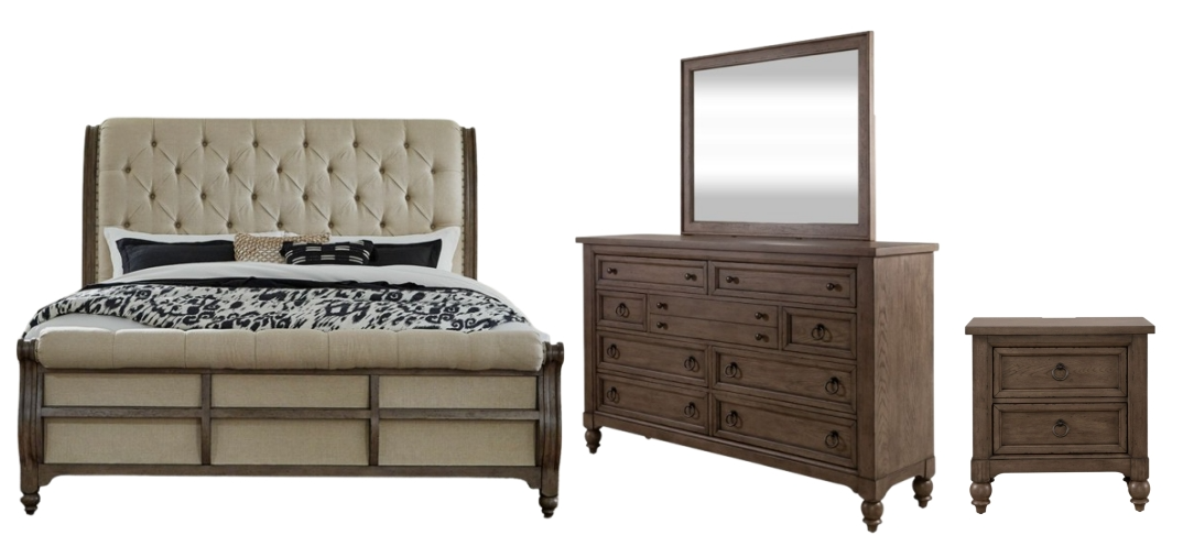 When details matter, choose the Americana Farmhouse queen sleigh bed, dresser, mirror, and nightstand. Crafted of poplar solids with white oak veneers, this kit features a wire-brushed dusty taupe finish with wormhole distressing, full extension drawers with wood framed drawer fronts, premium felt-lined top, and cedar lined bottom drawers, turned bun feet.Read More