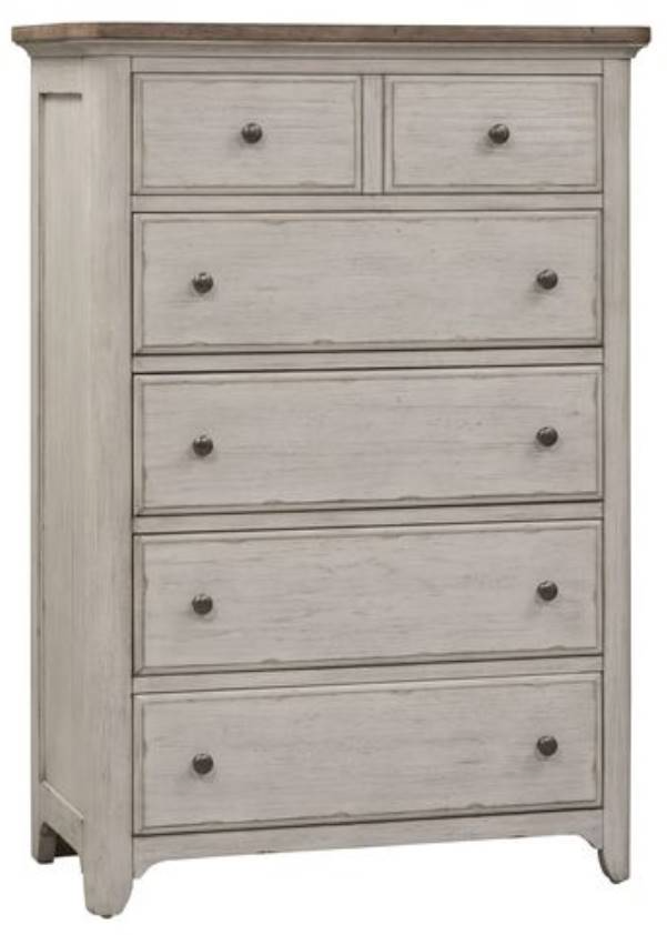 Settle in for cozy rest surrounded by the attractive Farmhouse Reimagined collection from Liberty Furniture. The rustic finish accentuated by romantic architecture and detailed craftsmanship form an enchanted sleep space full of special character. Create the setup of your dreams with ample storage options that help you organize and round out your bedroom’s presentation in chic fashion.