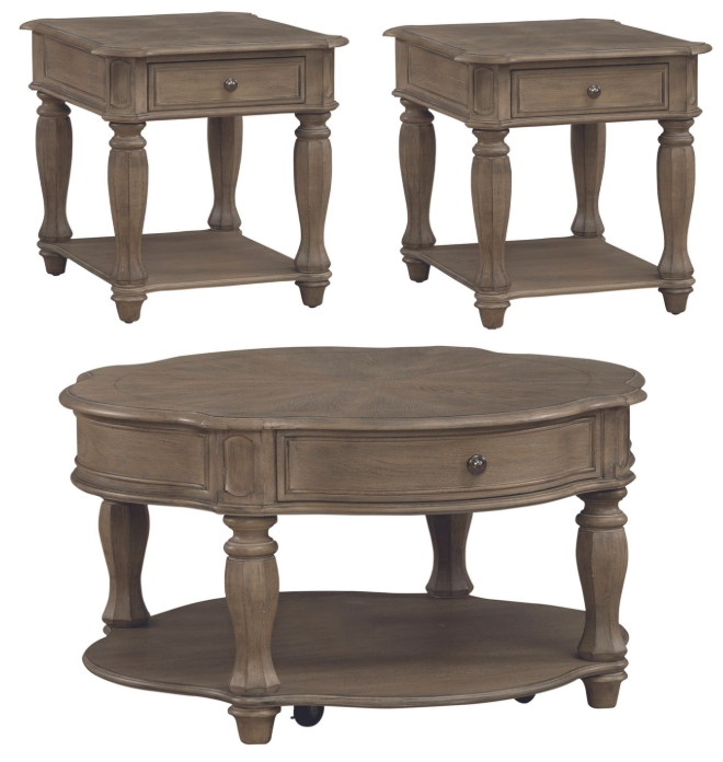 Elevate your living space with the Magnolia Manor 3 piece set. Meticulously crafted using Poplar solids with Quartered and Split Heart White Oak veneers, this set features a Weathered Bisque finish and includes the round cocktail table and 2 end tables.Read More