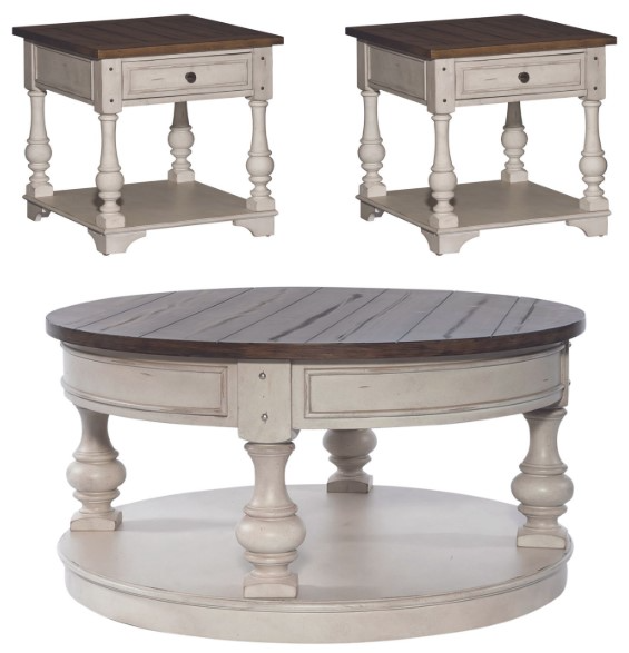 Features pewter nail head corner accents, one full extension drawer in end tables, a bottom shelf for additional storage, cocktail is castered for easy moveability and round turned post legs. The warm antique finishes and artistic distressing along with grand scale, makes this collection can be passed on for generations. Kit consists of one round cocktail table and two rectangle end tables.