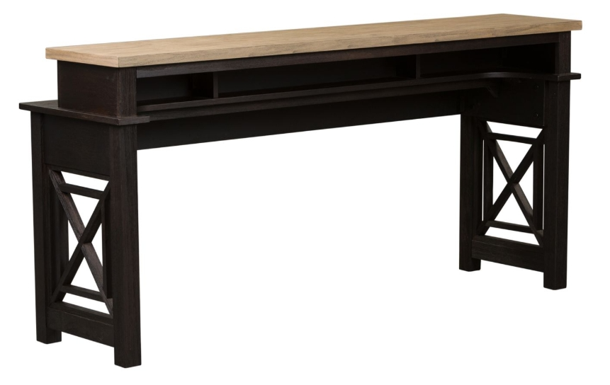 Transform your space with the Heatherbrook console bar table. Crafted of poplar solids and acacia veneers, this piece features a charcoal and ash finish, appealing open grid end panels, two electrical outlets and USB ports for easy access charging, anchored by a block leg design.Read More