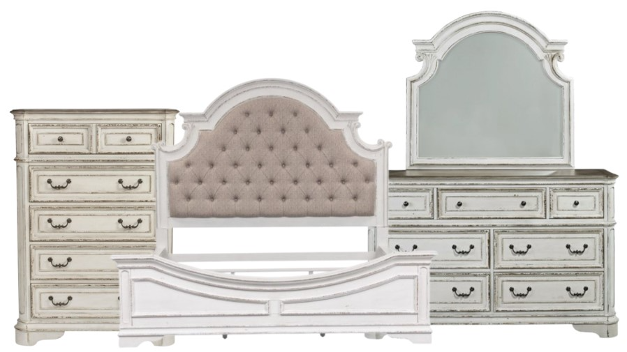 Opt for an elegant display. A refined yet relaxed feel describes the Magnolia Manor queen upholstered bed, dresser, mirror, and chest. Crafted of poplar solids with white oak and birch veneers, this kit features an antique white finish with heavy artistic chipping and weathered brown with whitewash tops.Read More