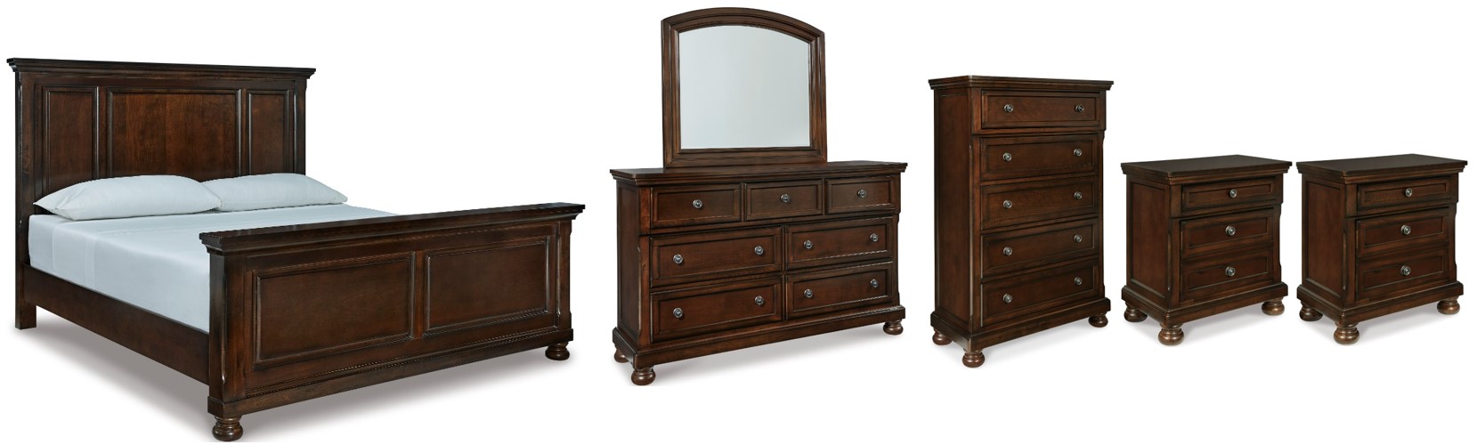 Includes bed (with headboard, footboard and rails), dresser with mirror, chest and 2 nightstands