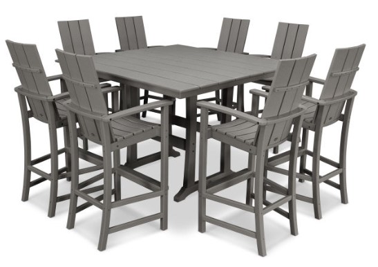 Complete the look of your outdoor living space with the Modern Adirondack 9-Piece Farmhouse Trestle Bar Set. Seating up to eight guests, this set includes Modern Adirondack Bar Chairs with three back slats for a sleek, modern aesthetic. The all-weather Farmhouse bar-height table allows space for plenty of leg room and provides a sleek plank style table top to compliment the straight lines of the chairs.Read More