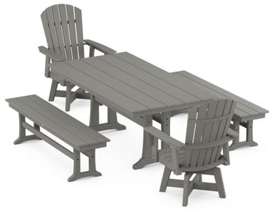 Bring the shore to your outdoors with the all-weather Nautical Curveback Adirondack Swivel Chair 5-Piece Farmhouse Dining Set With Trestle Legs and Benches, a family-friendly setup with mixed seating styles.