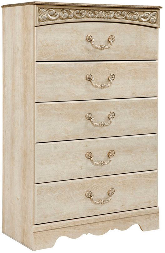 High in profile, the Catalina 5-drawer chest is adorned in ornate, bail-style pulls and a faux-marble top.