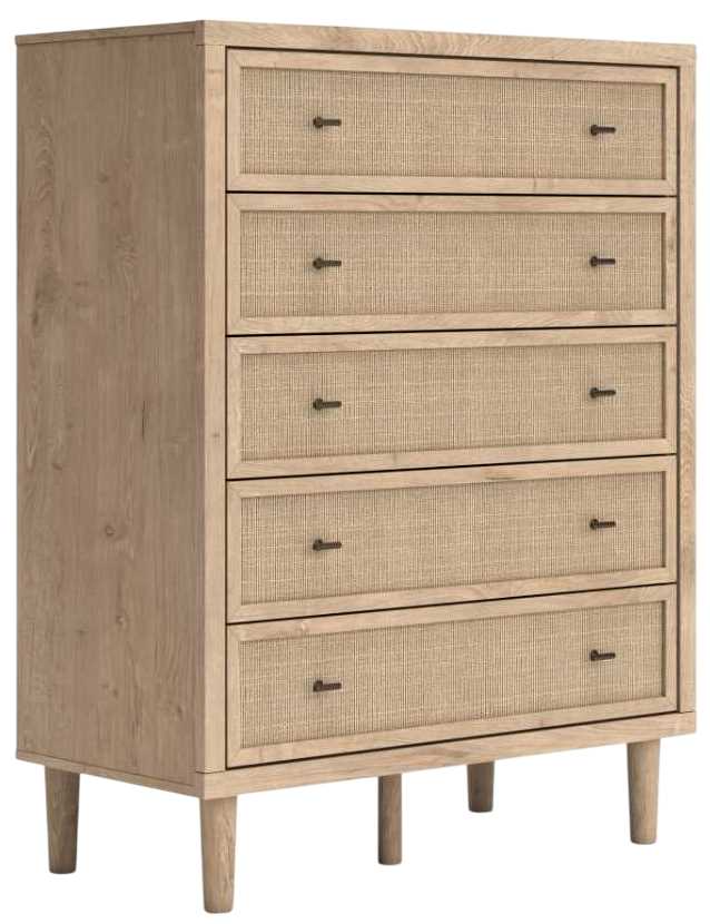 Clean-lined and contemporary—but far from stark—this chest of drawers is a fresh style awakening. Pairing a light finish with replicated oak grain and textured beige details that replicate the look of cane, its mixed materials bring a naturally versatile vibe to your bedroom. Sleek, simple hardware plays perfectly with the modern aesthetic.Read More