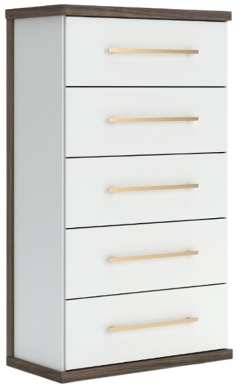 Looking to make a subtly striking statement in your bedroom? We've got you covered. This chest of drawers' sophisticated two-tone treatment marries a warm brown finish over replicated walnut grain with a matte white finish.Read More