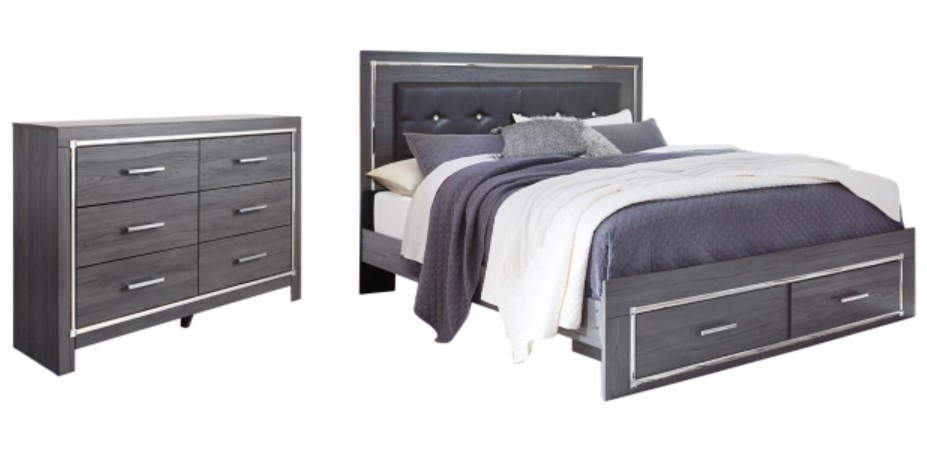 Includes panel bed (headboard, 2-drawer storage footboard and rails) and 6-drawer dresser