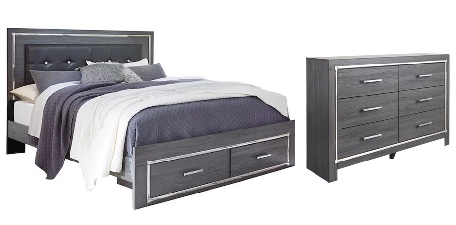 Includes panel bed (headboard, 2-drawer storage footboard and rails) and 6-drawer dresser