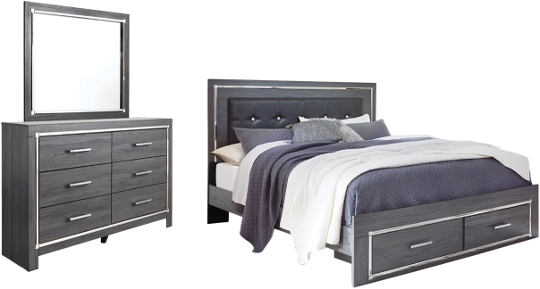 Reminiscent of Hollywood glamour of yesteryear, this bedroom set with king bed with storage and dresser/mirror interprets luxury in a decidedly modern way. Headboard details include button-tufted upholstery, faceted faux crystals and LED lights enhanced with remote-controlled settings for color and brightness. Chrome-tone drawer pulls and accents are a chic complement to the dazzling gray finish.Read More