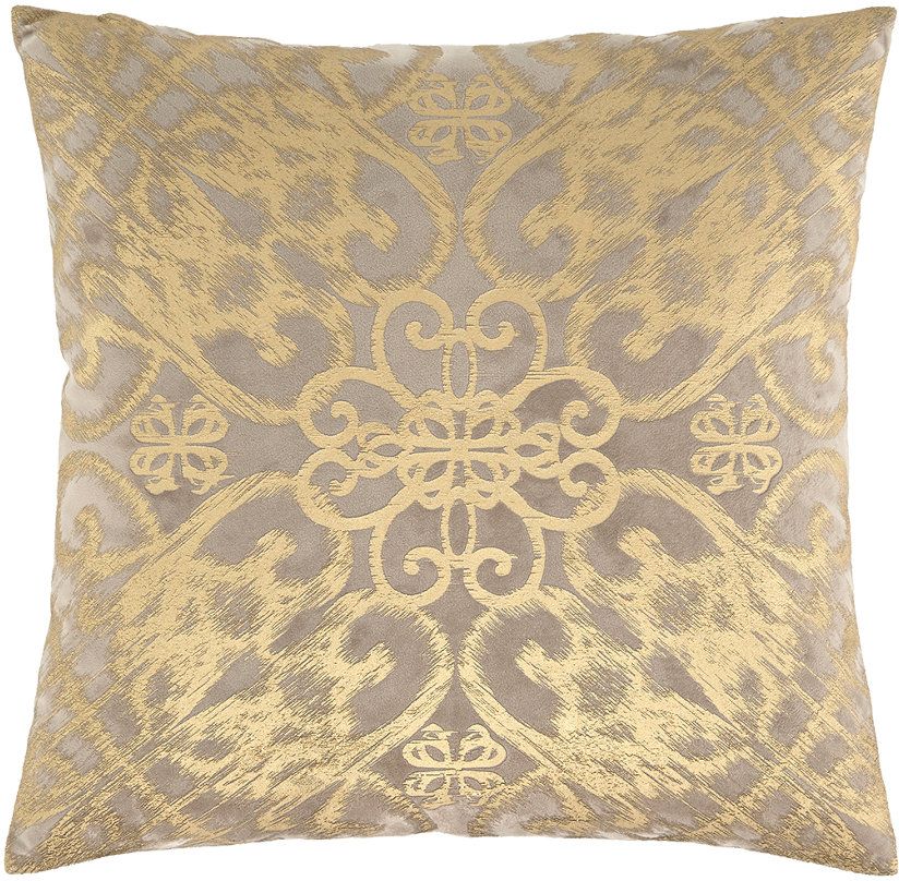 Punctuate your furniture with the Melina accent pillow. Beautiful gate pattern blurs as it scrolls outward. Goldtone over taupe faux suede puts the focus on the design without going over the top.