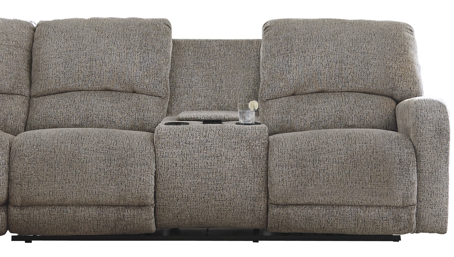 Frame constructions have been rigorously tested to simulate the home and transportation environments for improved durability. Corners are glued, blocked and stapled. Stripes and patterns are match cut. All fabrics are pre-approved for wearability and durability against AHFA standards. Cushions are constructed of low melt fiber wrapped over high quality foam. Features metal drop-in unitized seat box for strength and durability. All metal construction to the floor for strength and durability. The power reclining mechanism features infinite positions for comfort. This style features a console with storage and two cooling cup holders. This style also features back motor massage and a touch pad.