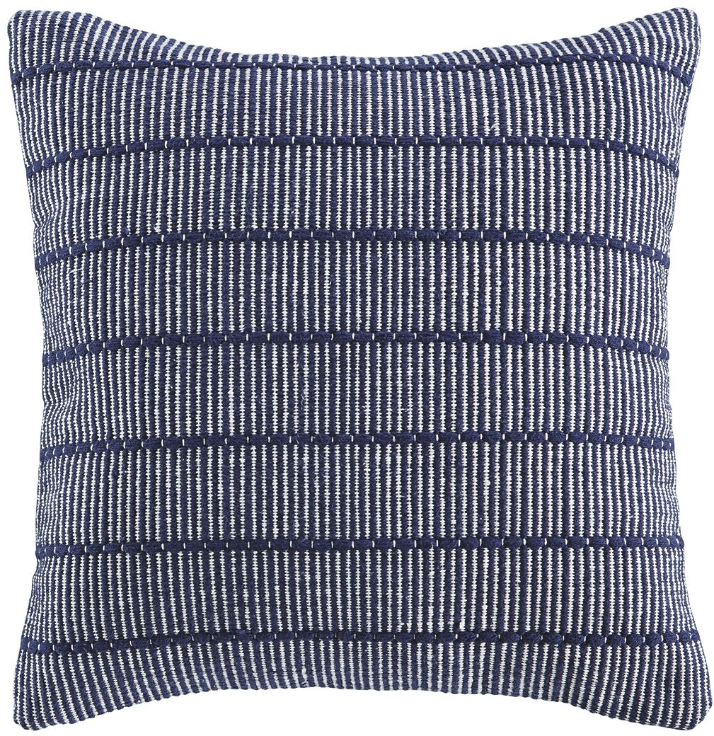 The Rabia set of 4 pillows is hand-woven with a navy-blue cover and a white, stylish stripe pattern.