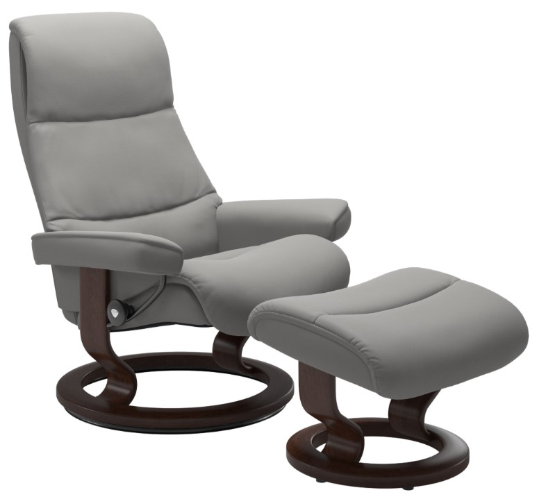 Soft and timeless. The Stressless View has ample cushioning, while retaining a timeless and modern cushion design with sleek contours. Fitted with a longer and slimmer back this recliner is great for those of us who need some extra length in the back.Read More