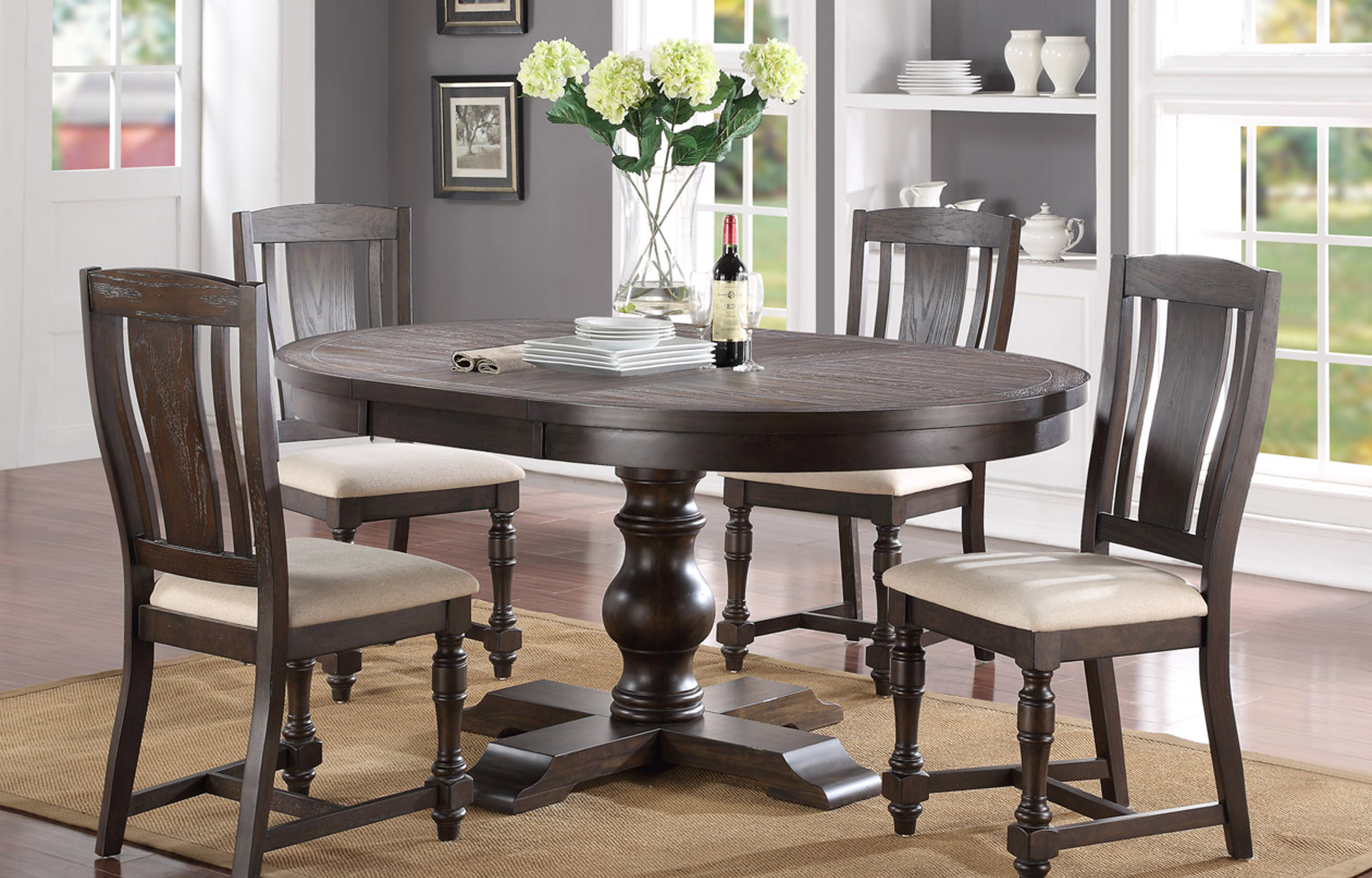 Gorgeous limed Gray or Espresso finishes enhance the contrasted oak wood grain of these grand tables. Mix and match upholstered and slat back chairs for an eclectic look.